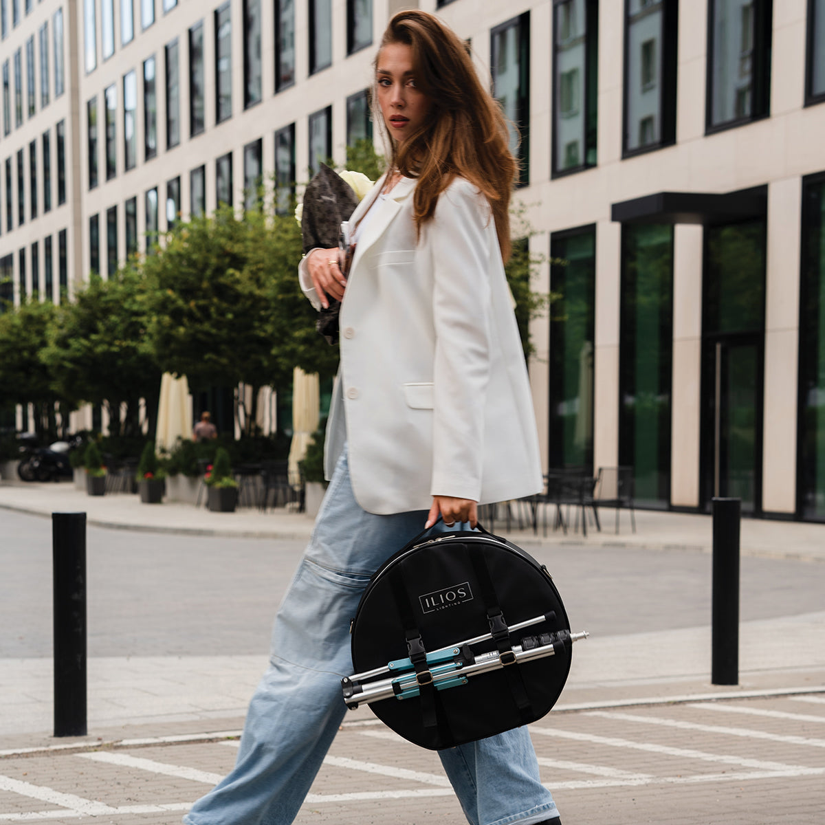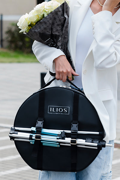Designed for makeup artists and content creators, this stylish case securely holds the light, power cord, phone holder, and mirror. With a removable shoulder strap and top handle for easy transport, it's ideal for professionals on the go. A unique pocket allows attachment to a wheeled bag, while adjustable straps secure a light stand, eliminating the need for extra bags.