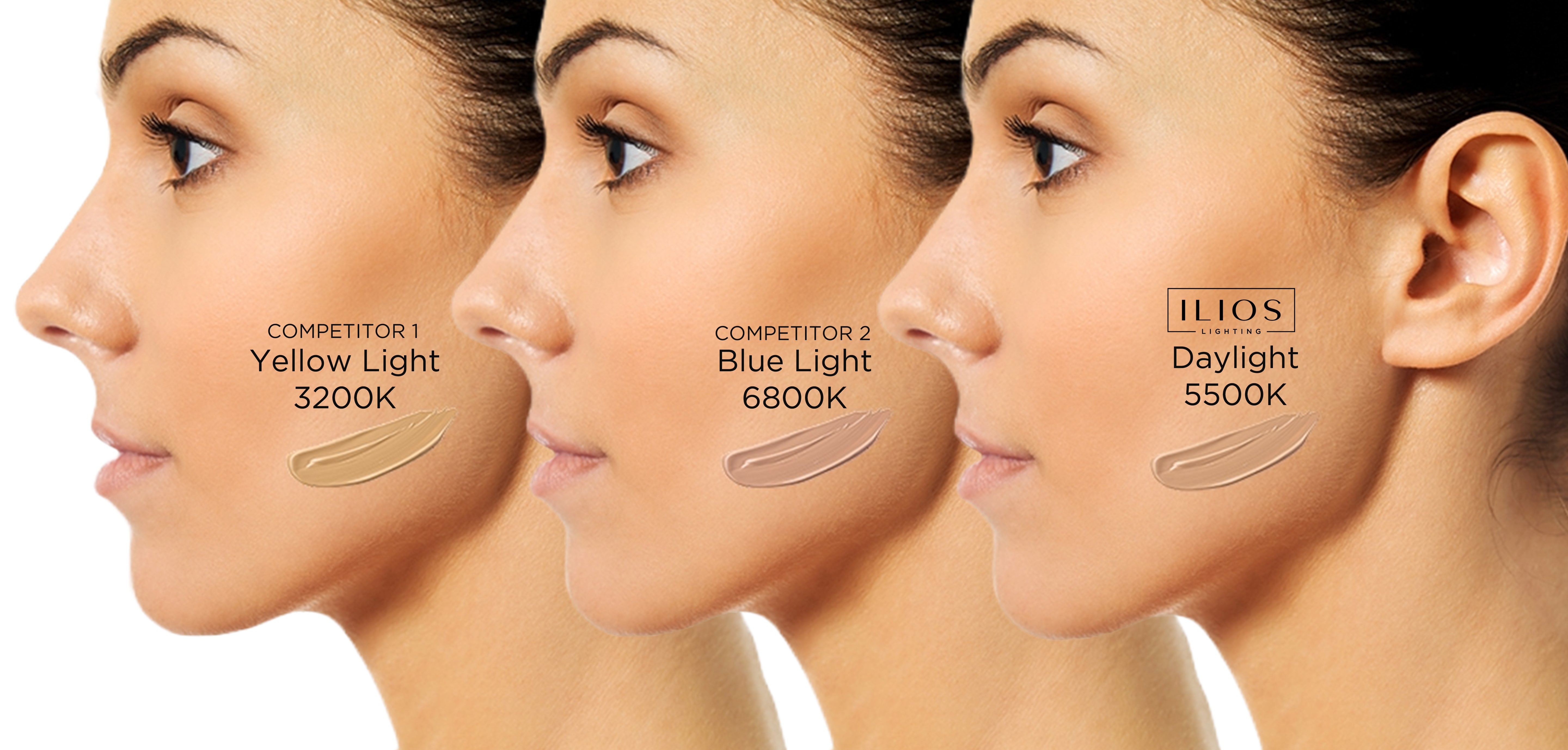 Over contouring occurs when the color you perceive in the mirror's reflection does not match what natural daylight reveals. Ilios measures at 5500K (pure white light) resulting in zero color shifting.
