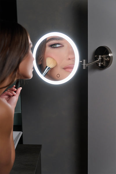 The Ilios makeup mirror is the first of its kind to achieve a 98 Color Rendering Index (CRI), closely simulating natural daylight and revealing every color detail perfectly. It utilizes high-quality LEDs, the same as those used in professional photo and film sets, ensuring unmatched clarity and accuracy for makeup application.