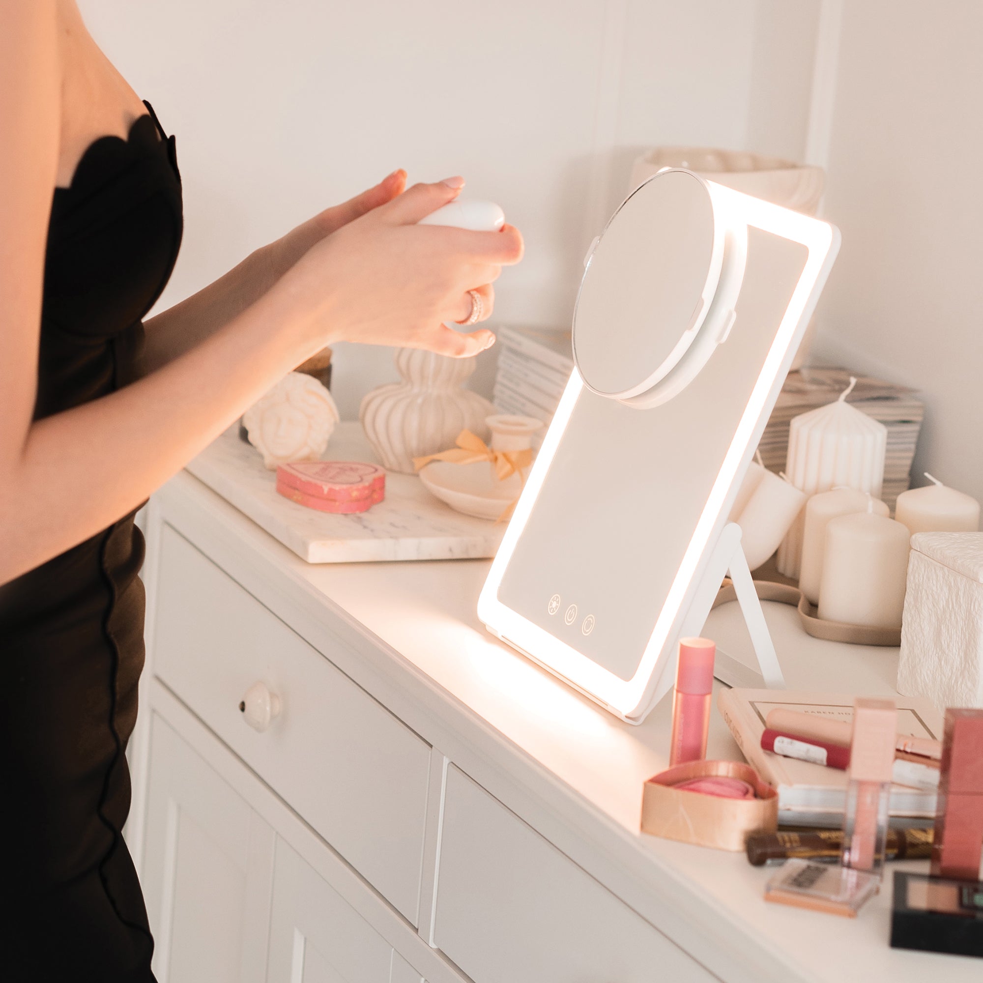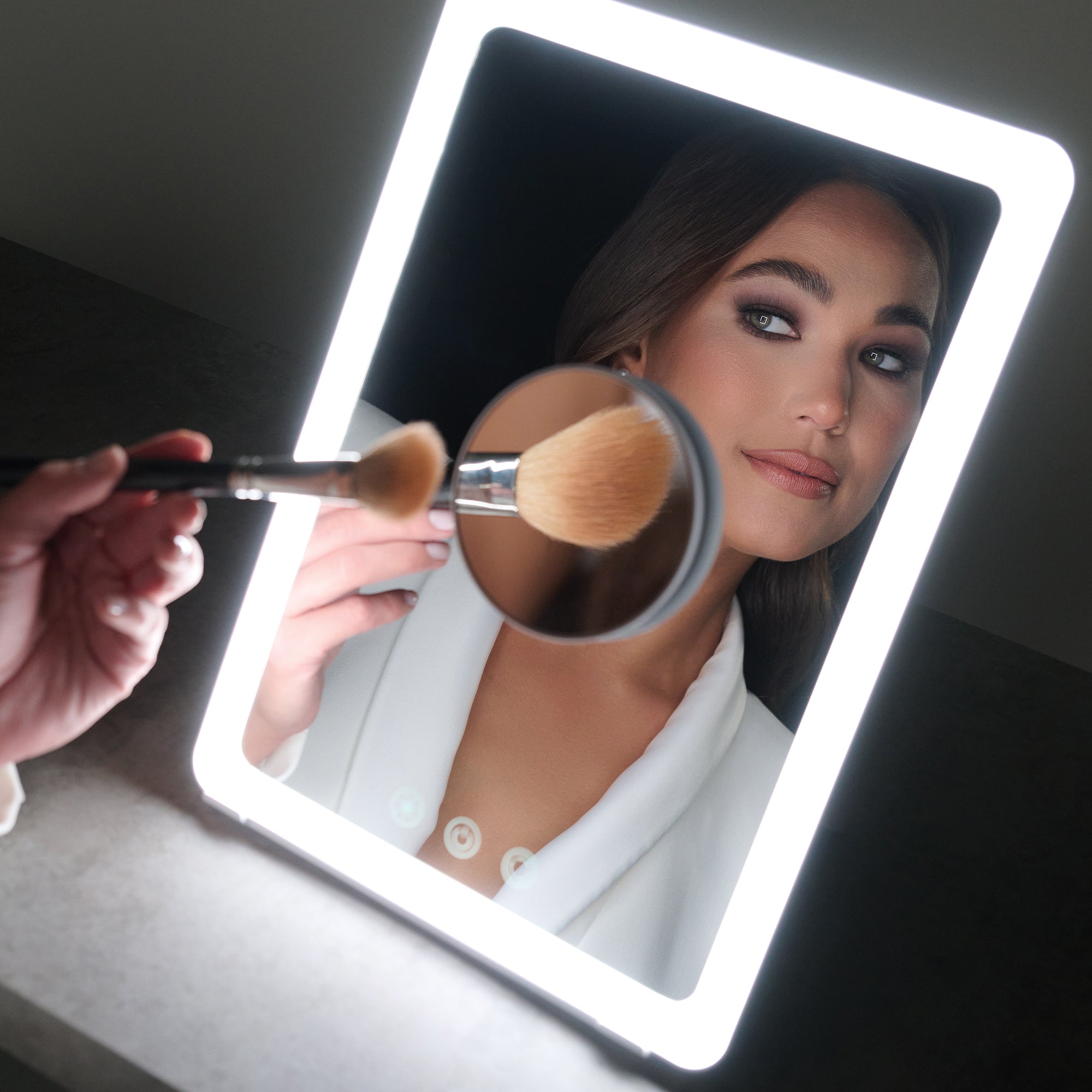 Introducing the Ilios Lighting Slim Rechargeable Makeup Mirror—the perfect combination of elegance and functionality. Weighing just 1.5 lbs., it features 5 dimming levels, 3 color modes, diffused LED lights for flawless makeup application, an adjustable stand, and convenient USB charging for on-the-go beauty.