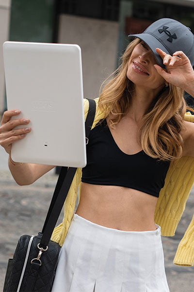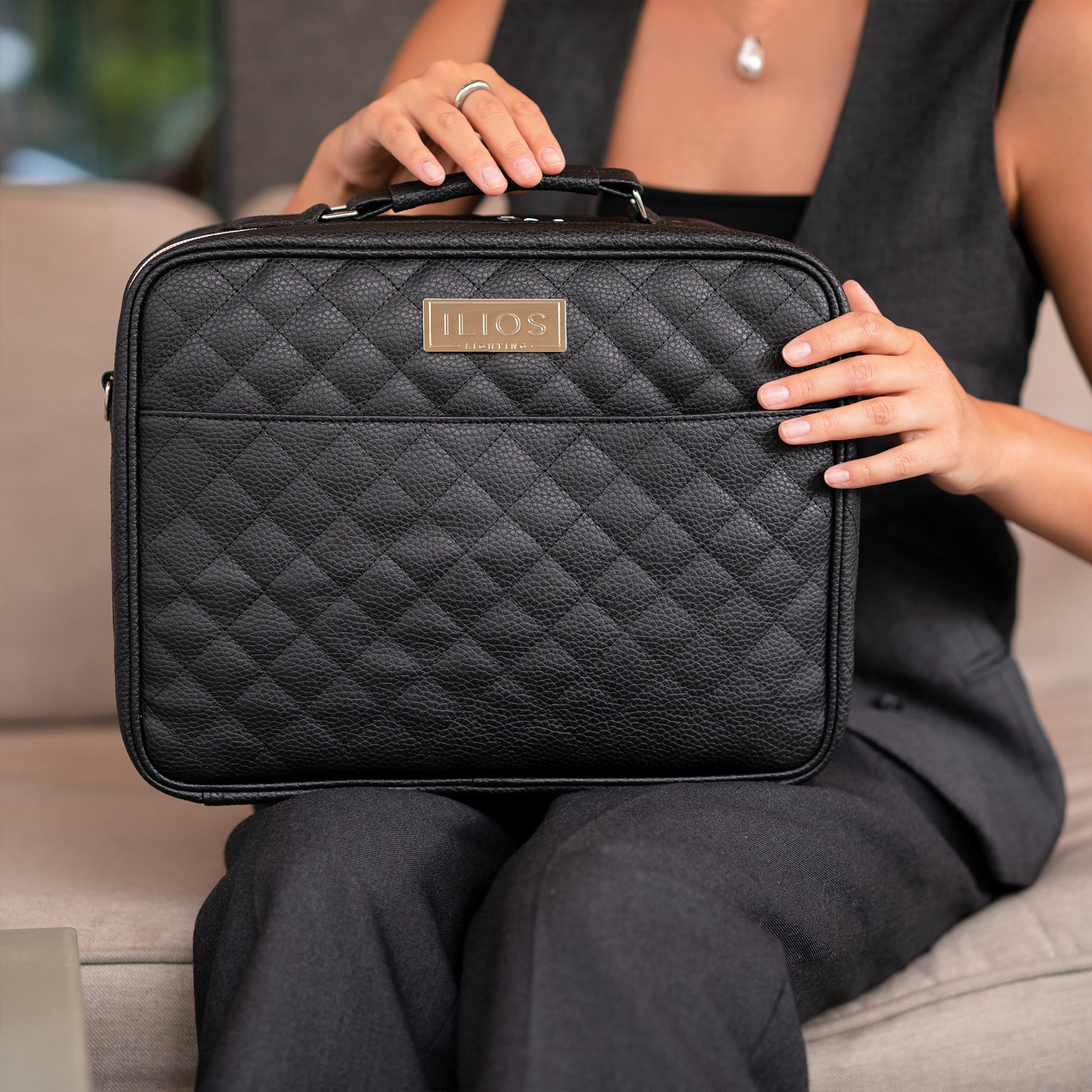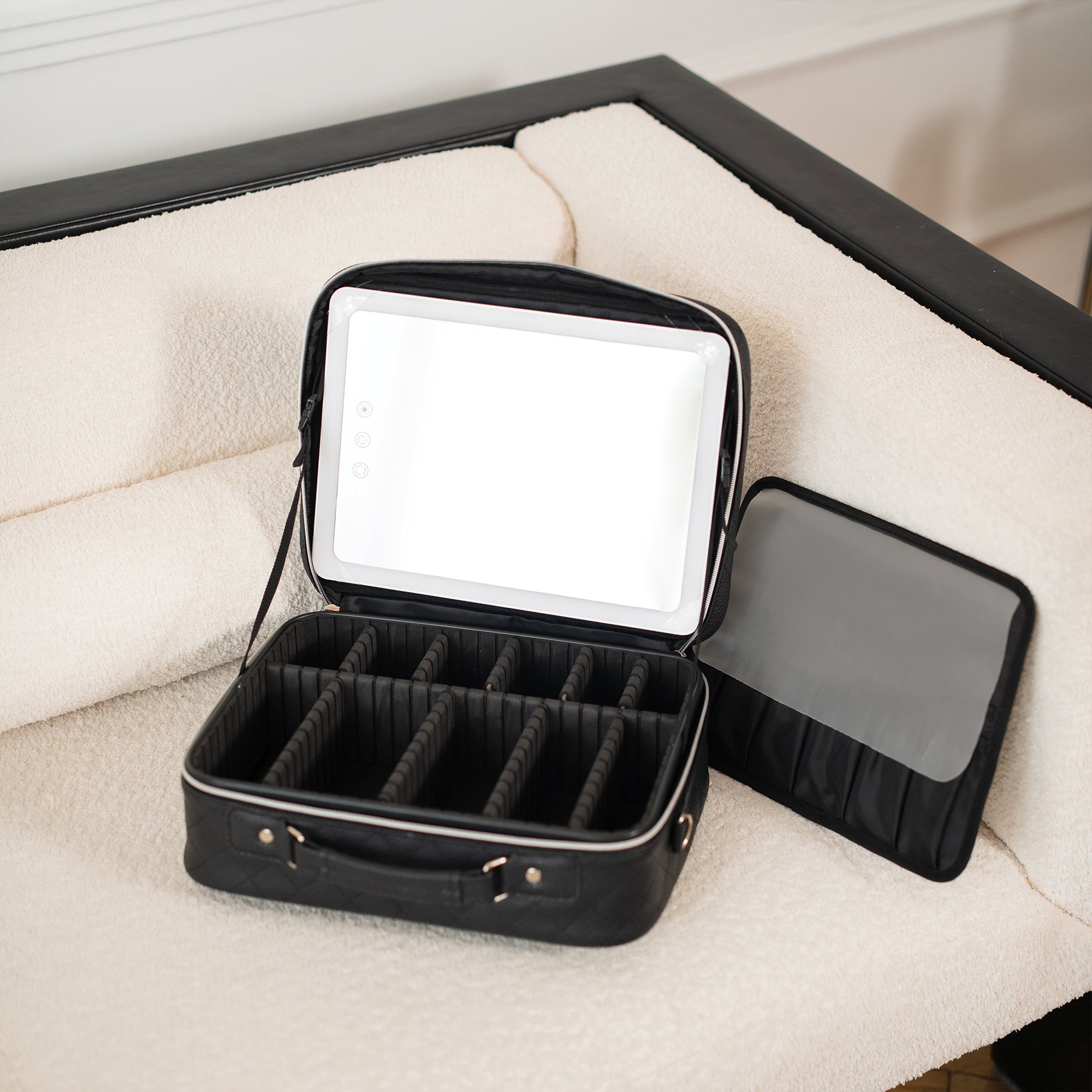 Bring the Slim Mirror on your next vacation in the stunning custom makeup case, which features adjustable dividers, a luggage sleeve, and a convenient shoulder strap.